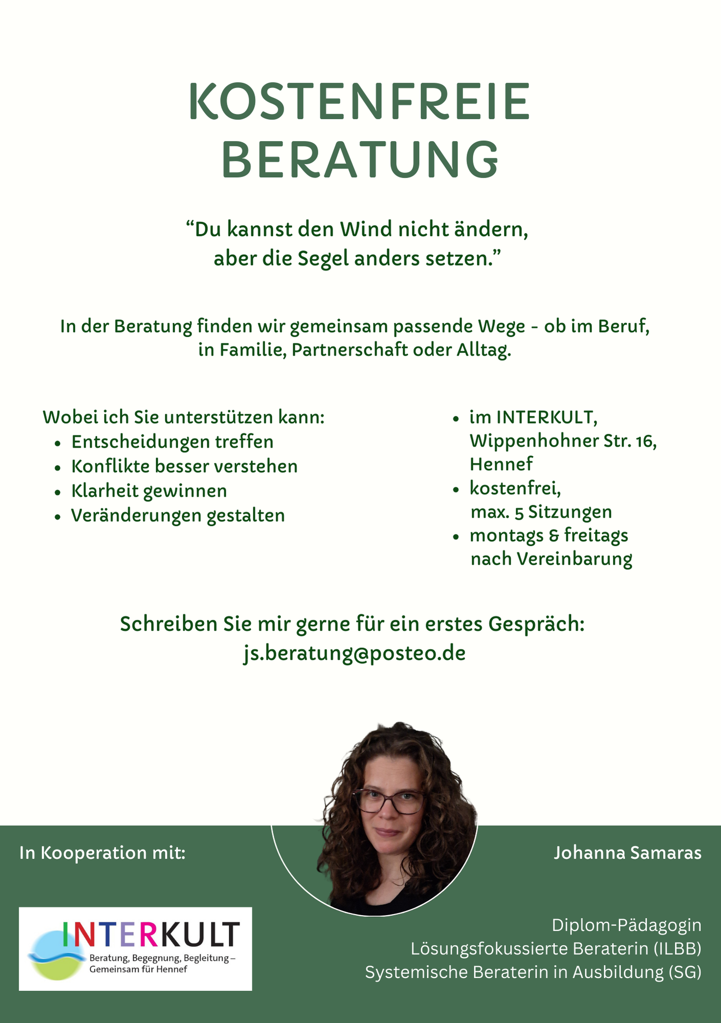Im INTERKULT gibt es ab September 2025 ein zusätzliches Beratungsangebot von Johanna Samaras. Frau Samaras bietet lösungsorientierte Beratung zu verschiedenen Themen wie Beruf, Familie, Partnerschaf...