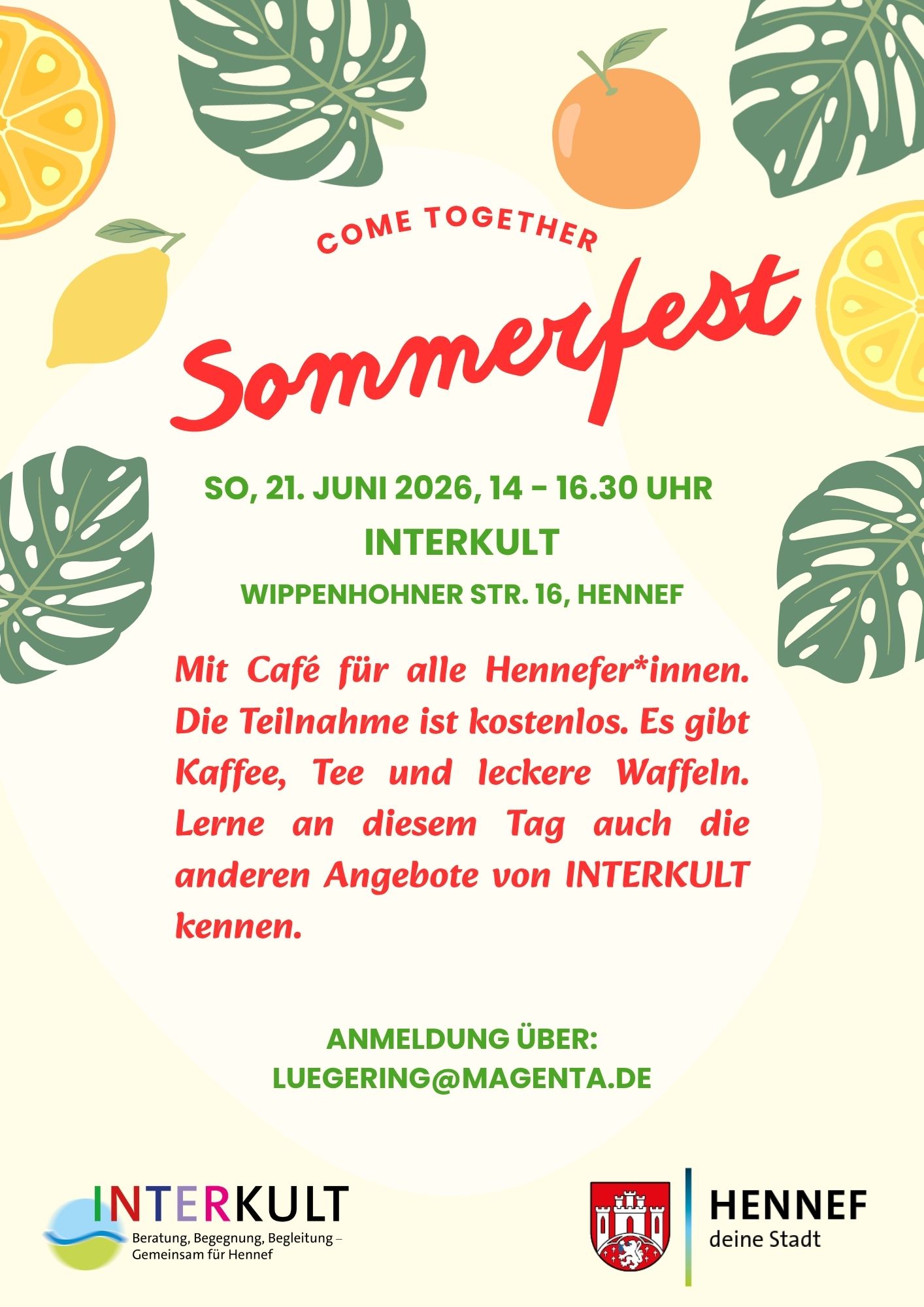 Am 21.06.2026 von 14.00 – 16.30 Uhr findet ein Come together-Sommerfest im INTERKULT statt. Die Teilnahme ist kostenlos. Anmeldungen werden erbeten. Nähere Informationen siehe Flyer....